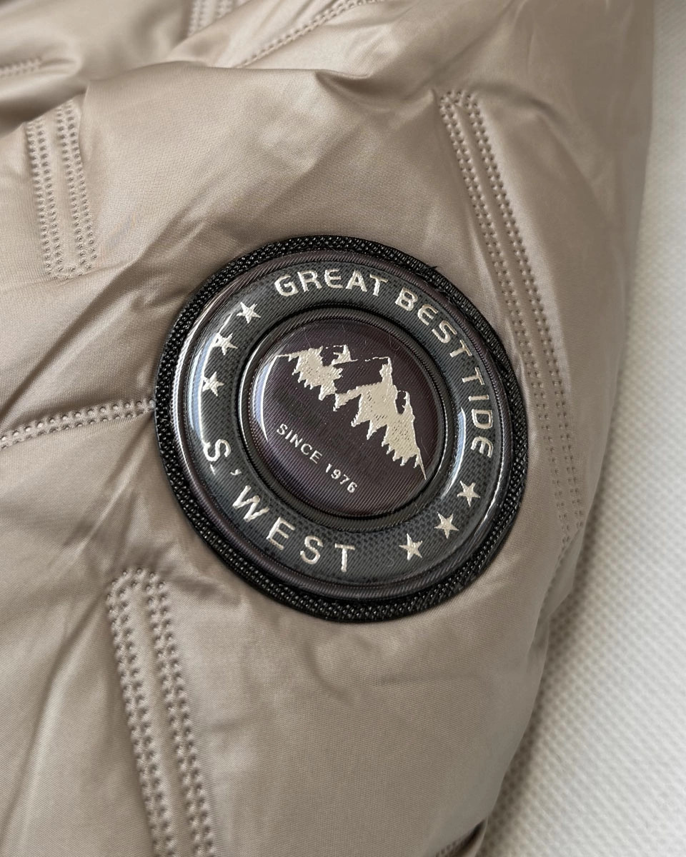 Bunda má jednoduchý střih, je lehce zateplená syntetickou péřovou výplní, má dvě kapsy a zapíná se zipem. Model má kapuci, kterou není možné odepnout. Ozdobné prvky mají zlatou barvu. Bunda má délku k bokům.