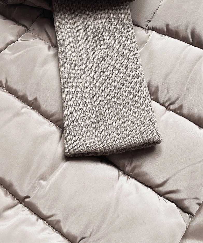 Bunda je prošívaná, je zateplená syntetickou péřovou výplní, má dvě kapsy a zapíná se zipem. Model má stojáček. Rukávy jsou olemované dlouhými stahovacími lemy.