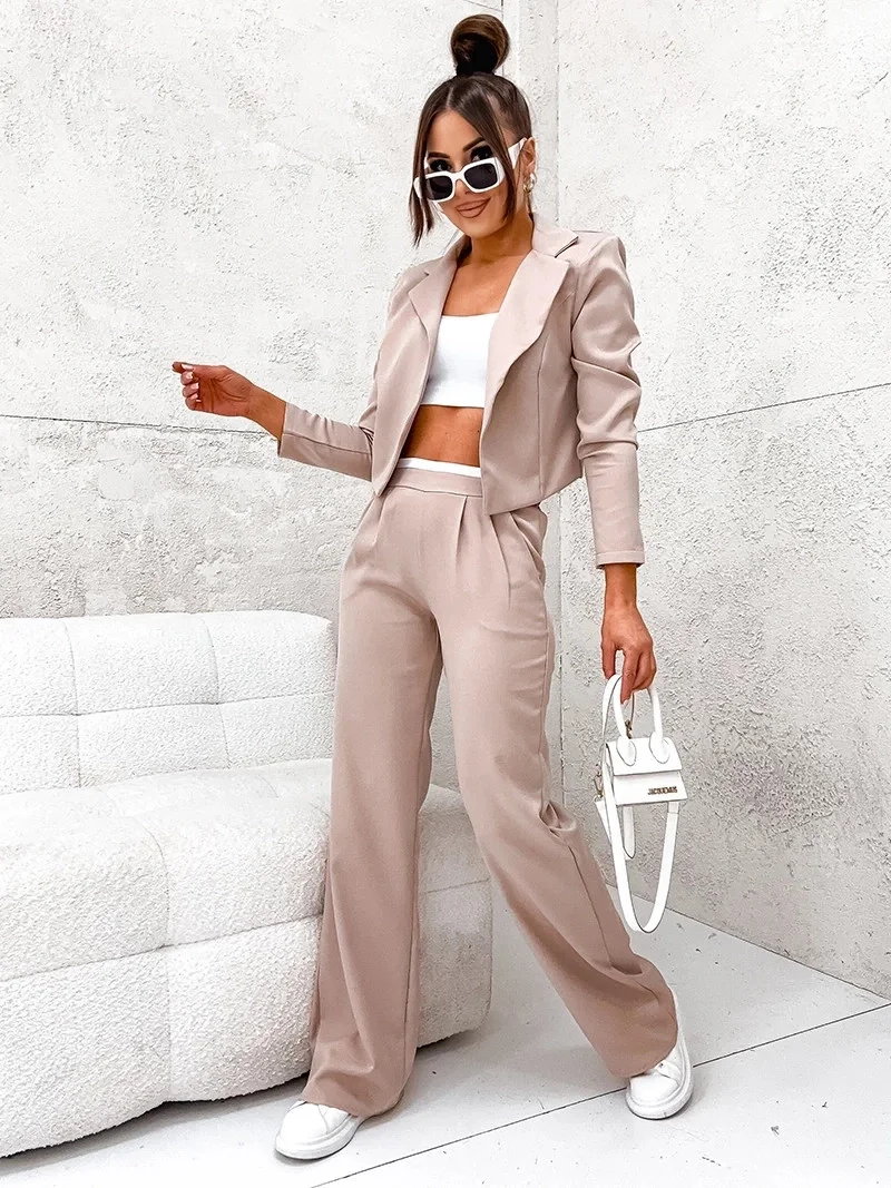 Béžový dámský komplet krátké sako a široké kalhoty model 19763935 - Moon