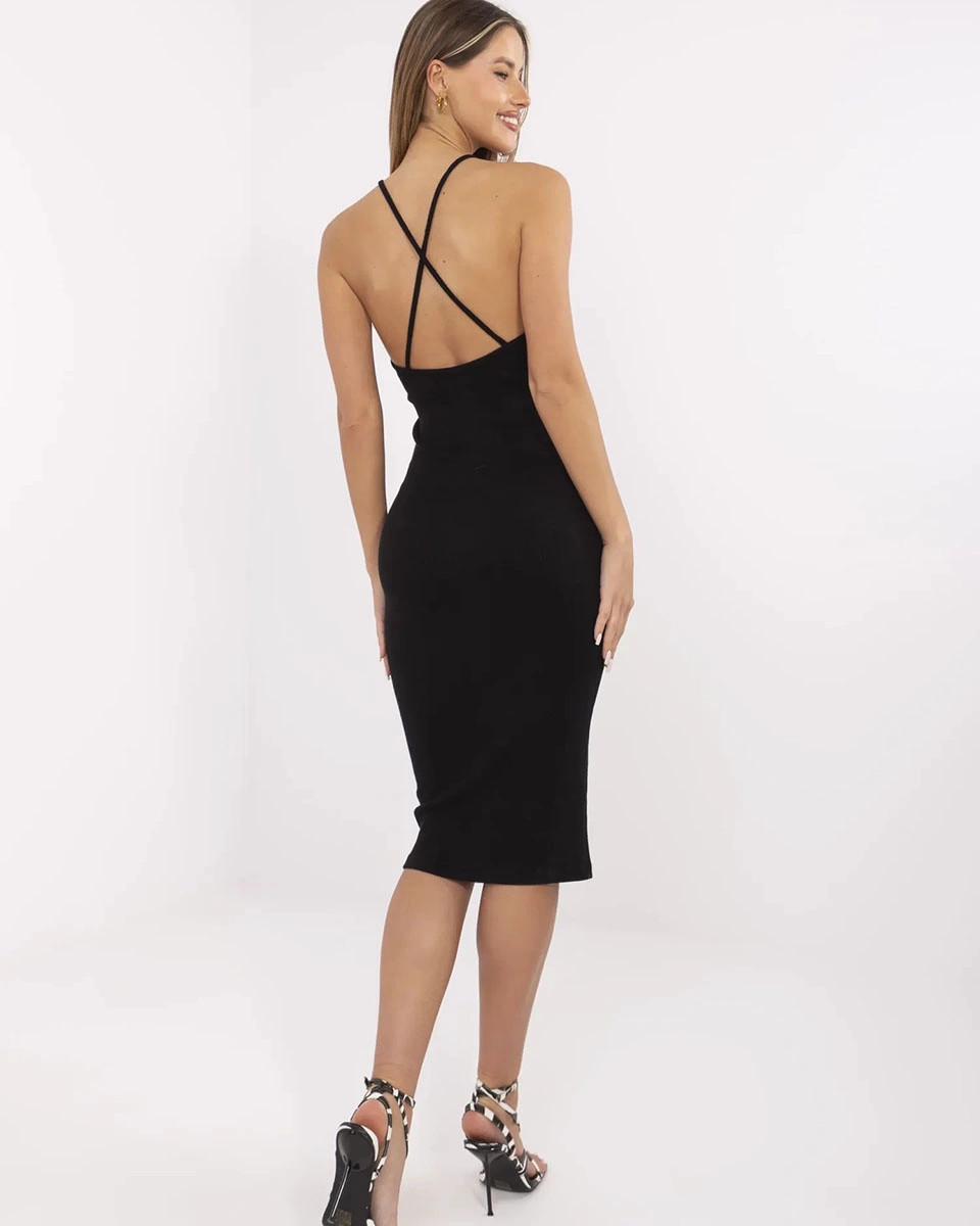 Šaty jsou vyrobené z žebrovaného materiálu a jsou na ramínkách, která se na zádech kříží. Model má délku do poloviny lýtek.