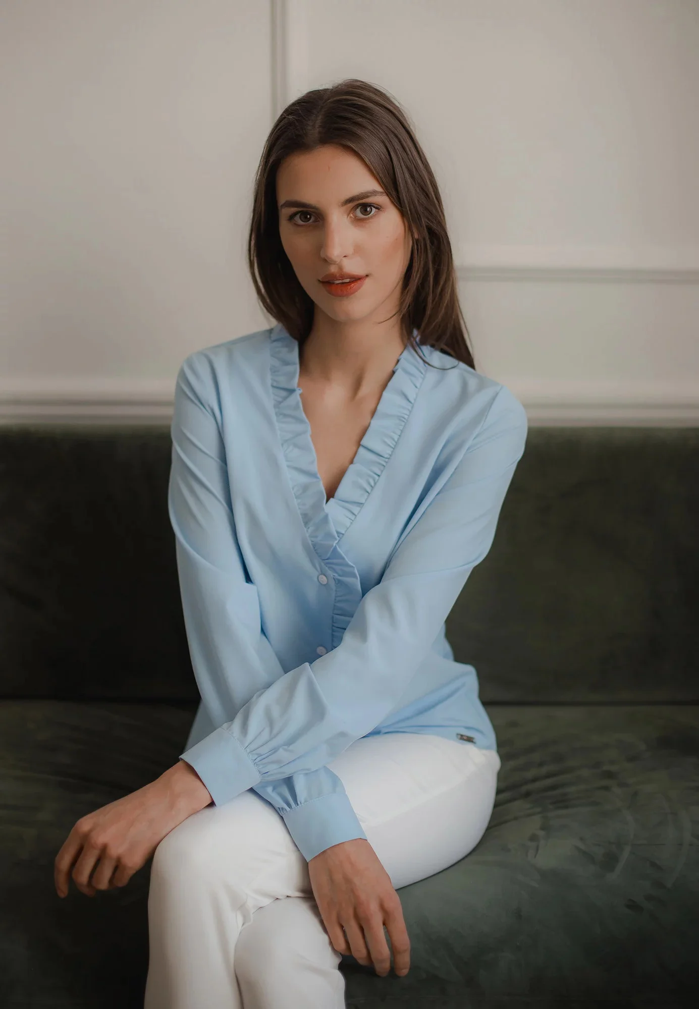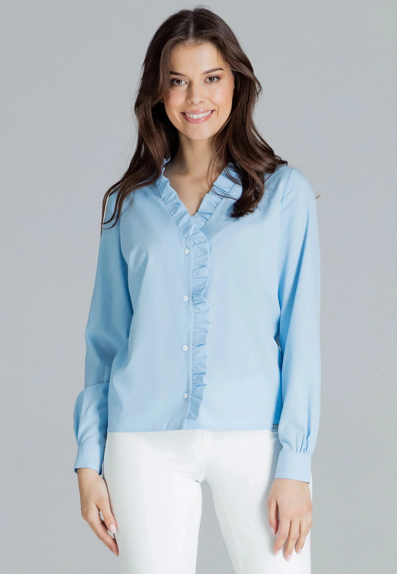 Klasická jednoduchá halenka s véčkovým výstřihem a volánem po celé délce. Dlouhý rukáv s nařasenou manžetou. Zapínání na knoflíky vpředu.