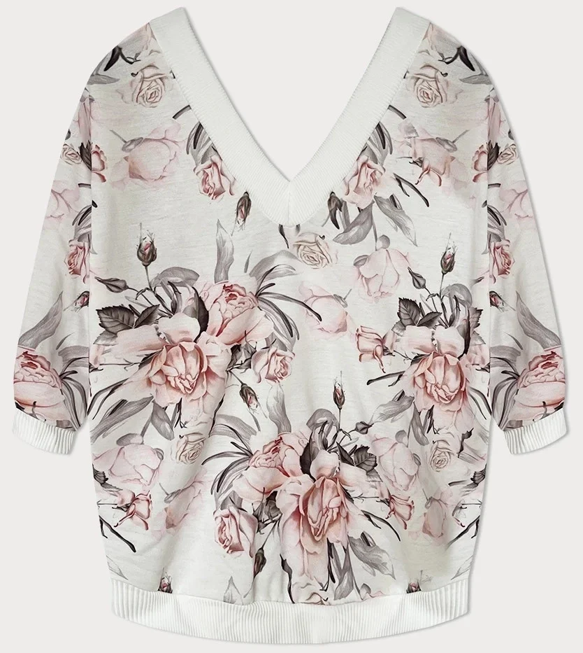 Halenka je vyrobená z pružného materiálu, má 3/4 rukávy a je olemovaná stahovacími lemy. Ve přední i v zadní části je výstřih ve tvaru písmene "V". Model má délku k bokům.
