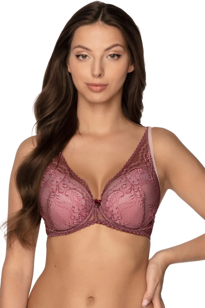 Push-up podprsenka, košíčky v jemné rós barvě pokryté vínovou krajkou prodlouženou vysoko na ramínku, která dodává IRENE sexy charakter. Vyjímatelná Push-Up vložka, konstrukce zvedá a zvýrazňuje poprsí, spodní část košíčku je vyrobena z pěny, kteráóra chrání prsa a poskytuje jim velmi dobrou oporu.