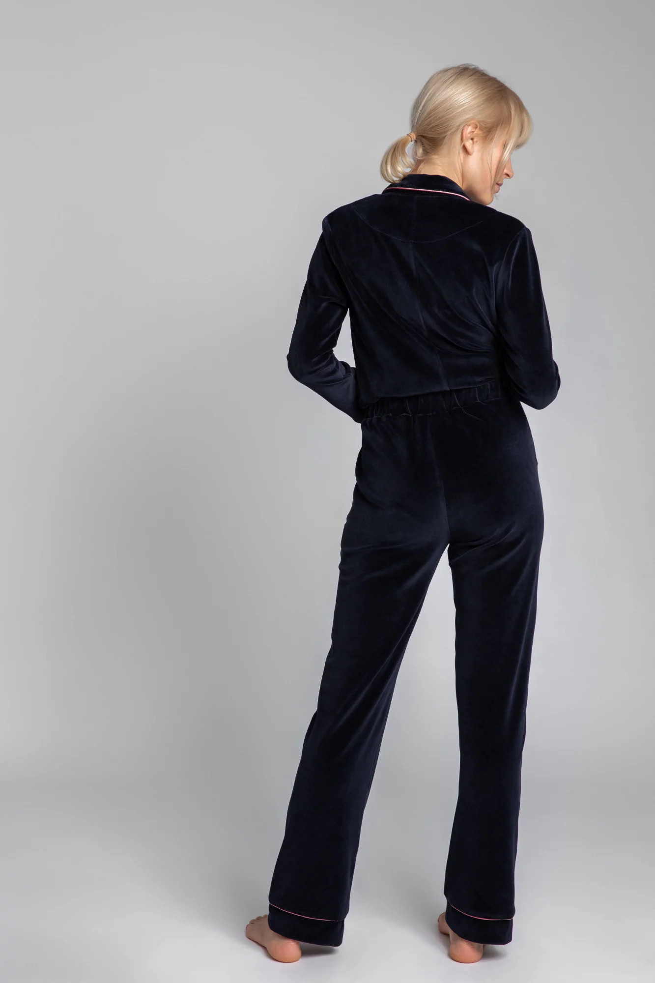 Spěte, ale stylově v těchto sametových kalhotách s manžetami a ozdobným lemováním, které mají siluetu inspirovanou pánskou módou. Vytvořte si soupravu s naší sametovou pyžamovou košilí s ozdobným lemováním.