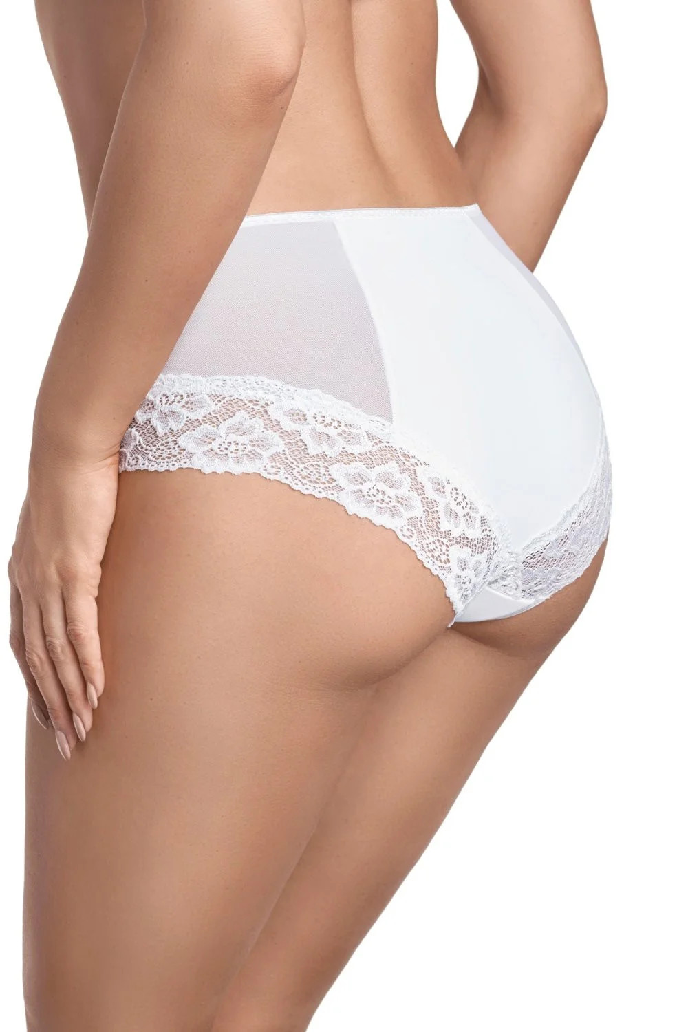 Klasické vysoké kalhotky 029 Ewana - bílá barva - klasický střih - na bocích plnější - vyrobené z hladkého mikrovlákna, jemné tylové síťoviny a z efektní krajky s květinovým motivem