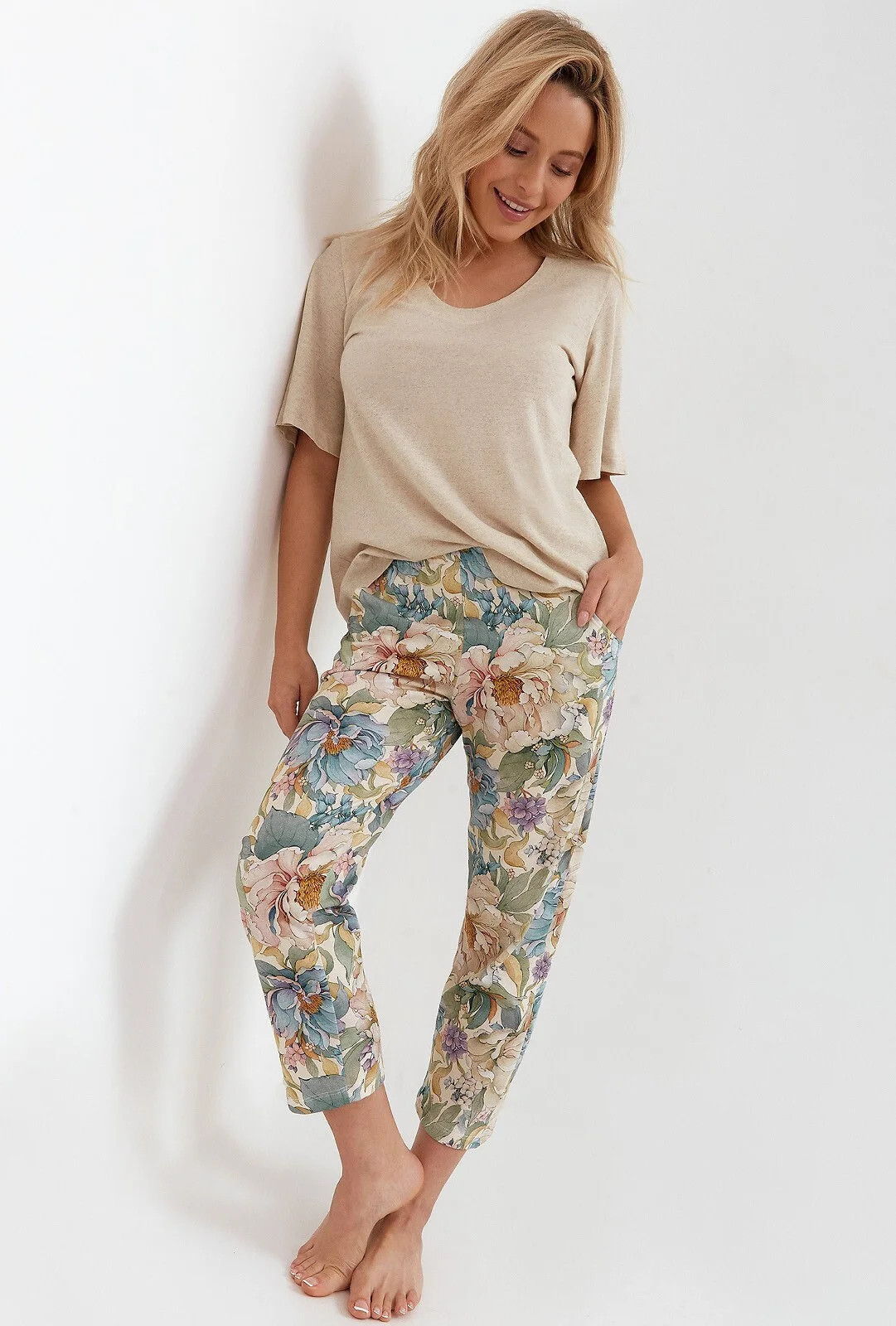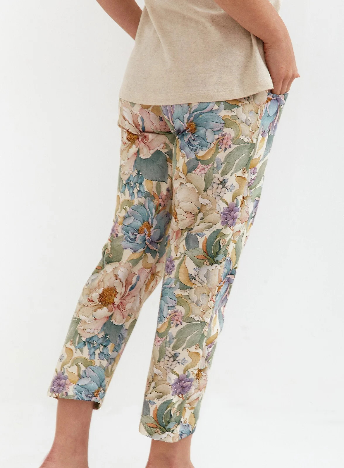 - bavlněné kalhoty s dlouhými nohavicemi s květinovým potiskem