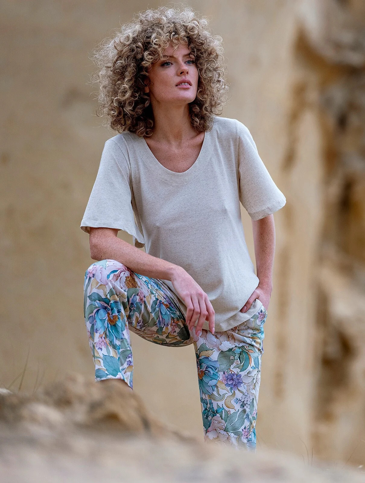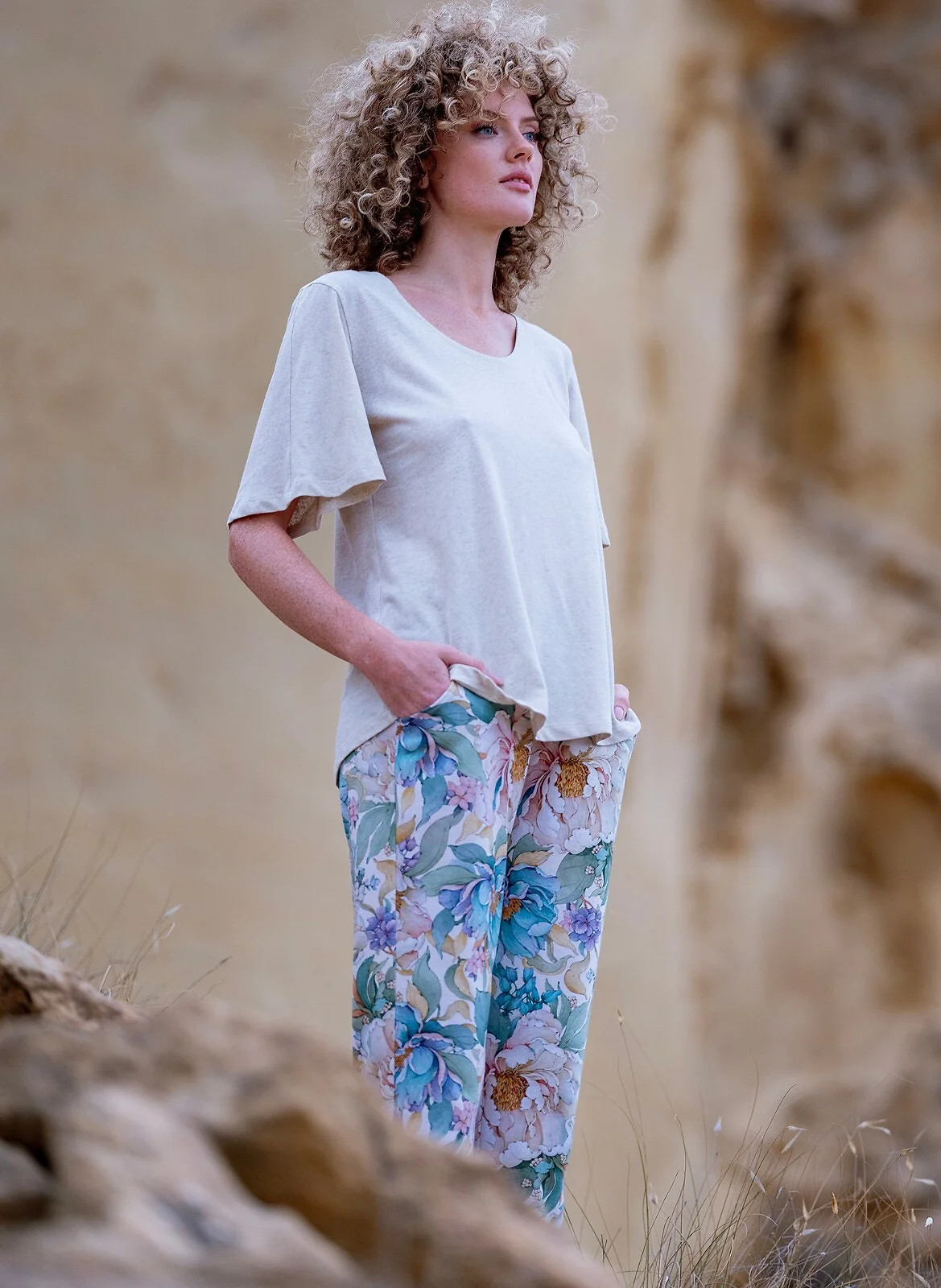 Složení: tričko - 75 % viskóza, 20 % len, 5 % elastan, kalhoty - 100 % bavlna