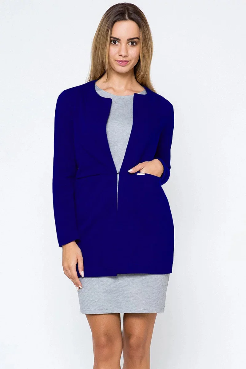 Elegantní sako krabicového střihu s předními kapsami. Kovová ozdoba na kapse. Model se zapínáním na háček a oko. Vyrobeno z měkkého, pružného úpletu. Vynikající kvalita šití s důrazem na detail.