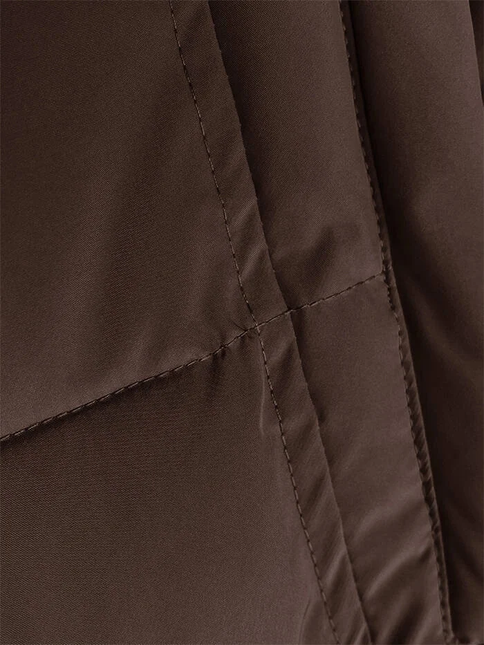 Bunda je vypasovaná, je zateplená vrstvou syntetické péřové výplně, má kožešinovou podšívku, dvě kapsy a zapíná se zipem. Kapuci lemuje kožešina, kterou je možné odepnout. Na koncích rukávů jsou skryté stahovací lemy. Model má délku do poloviny stehen.