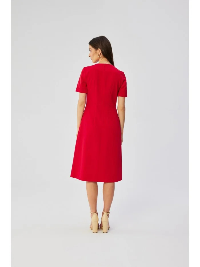 65 % polyester 30 % viskóza 5 % elastan DETAILY PRODUKTU: tkané šaty s ozdobnými záhyby na bocích výstřih s klíčovou dírkou krátké rukávy s ohrnutím pod kolena skrytý zip na zádech bez podšívky naše modelka je 176 cm vysoká a nosí velikost S navrženo a vyrobeno v Polsku