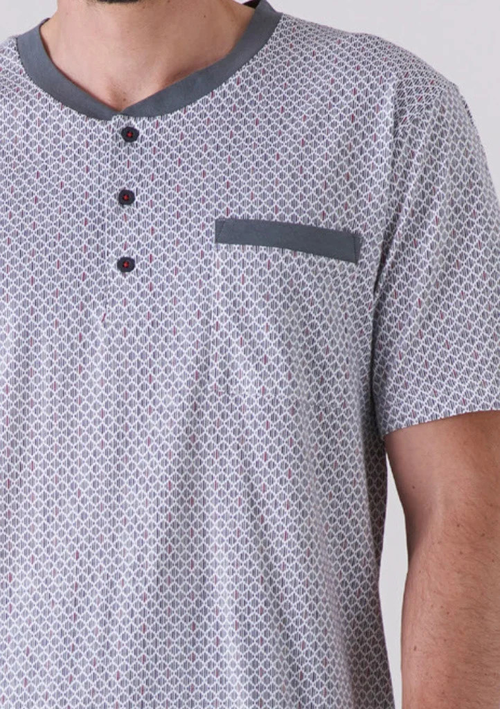 Pánské bavlněné pyžamo italské značky Karelpiu. Pyžamo ze 100% bavlny, je velmi příjemné a pohodlné. Tričko má kulatý výstřih a légu se třemi knoflíky. Na levé přední straně je našitá kapsička. Tričko má krátký rukáv. Kalhoty mají v pase pohodlnou pružnou gumu, nohavice jsou ukončeny širokou mnažetou.