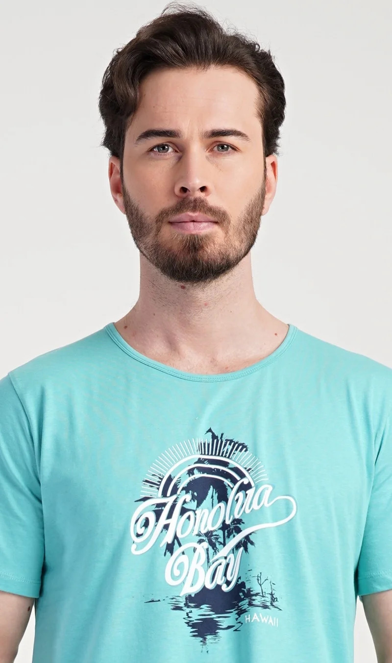 Pánské bavlněné pyžamo šortky Honolua bay. Pánské pyžamo se skládá z trička s krátkým rukávem a krátkých šortkových kalhot. Na tričku je obrázek malého ostrova a nápis 'Honolua bay'. Tričko doplňují kárované šortky, které mají v pase gumu a šňůrku na stažení, nemají kapsy. Použitý materiál s obsahem bavlny 100% je příjemný a poddajný na dotek.