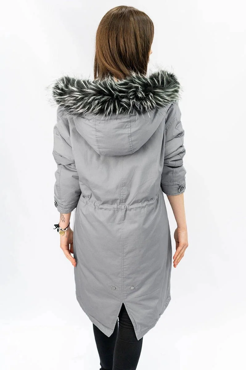 BAWEŁNIANA PARKA DAMSKA ZIMOWA Z PUCHEM NATURALNYM SZARA (7085)