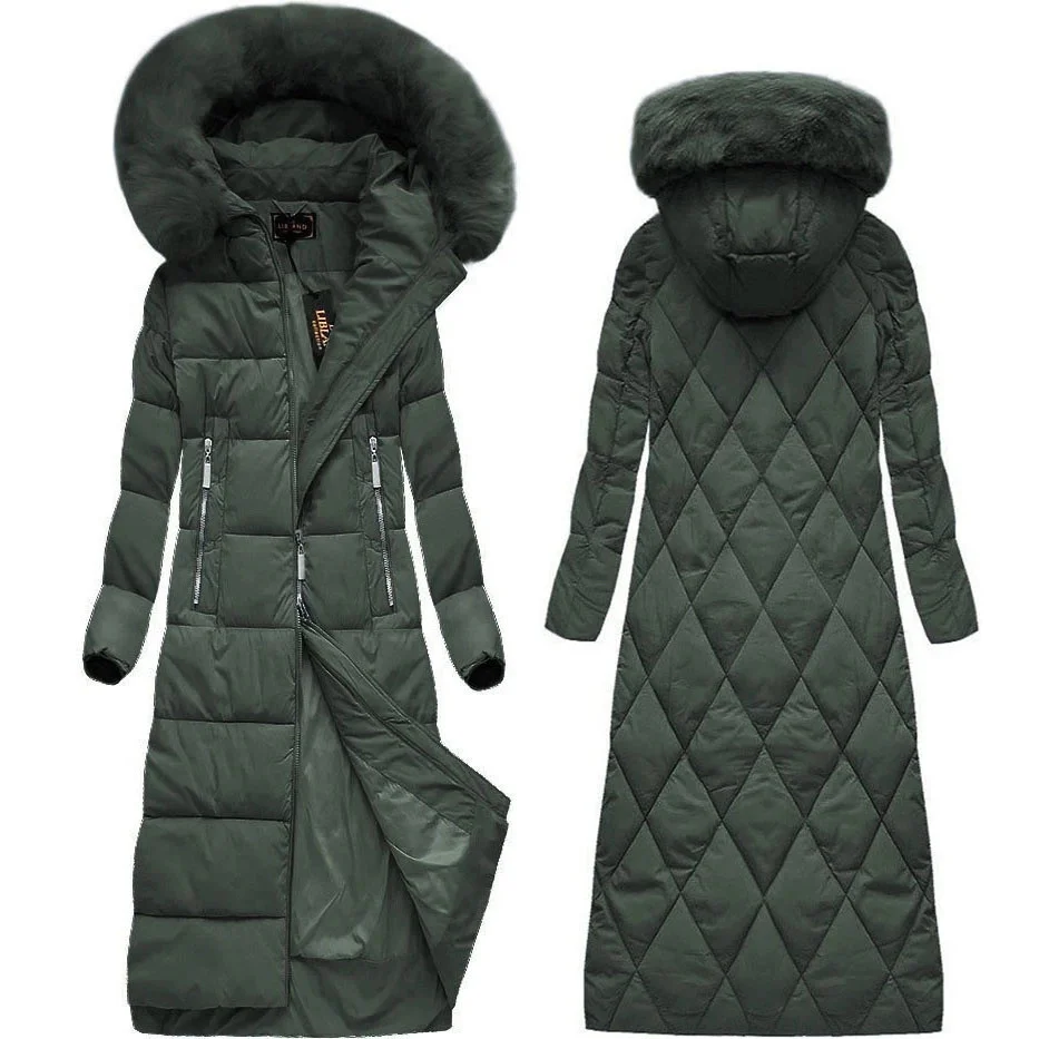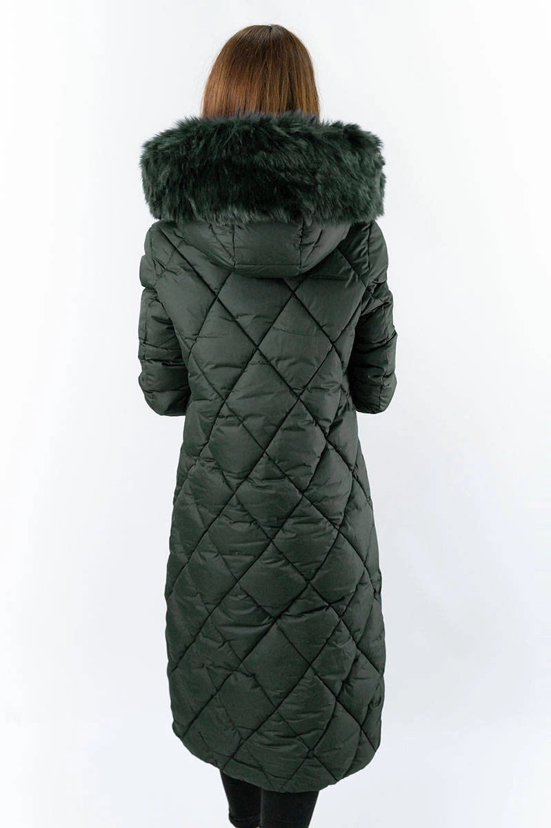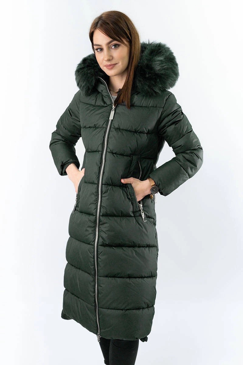 Dámska dlhá zimná bunda vo fľaškovo zelenej farbe s kapucňou (7688BIG)