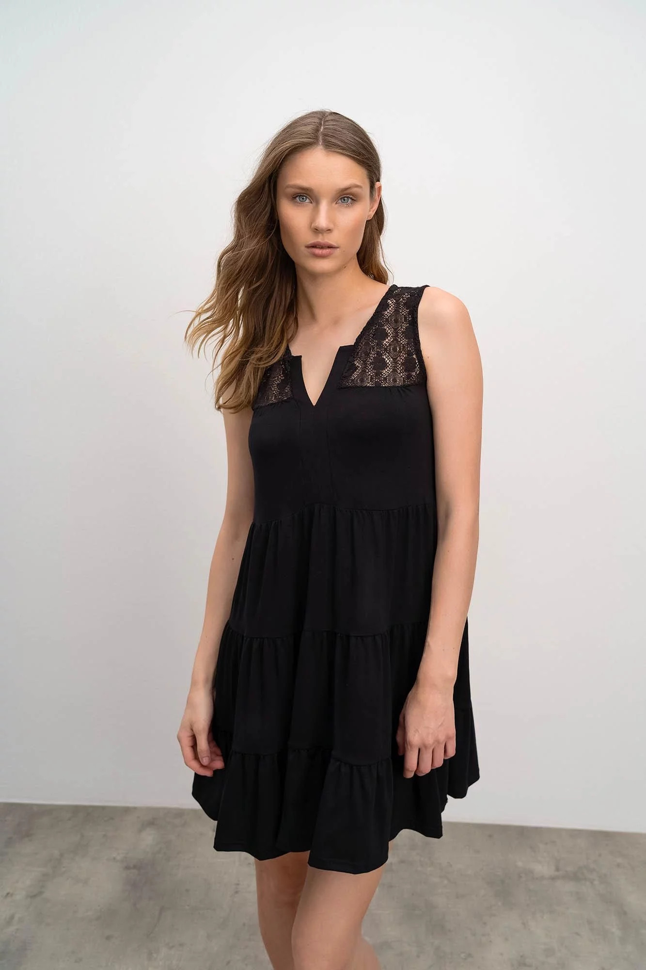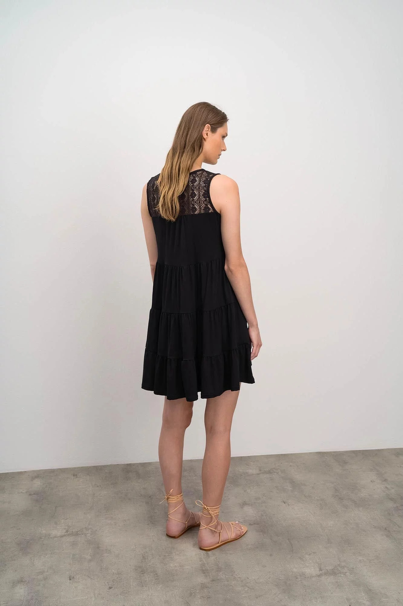 Dámske šaty z viskózy, bez rukávov, vrchná časť z luxusnej čipky. Šaty sú postupne rozšírené v štýle volánov.