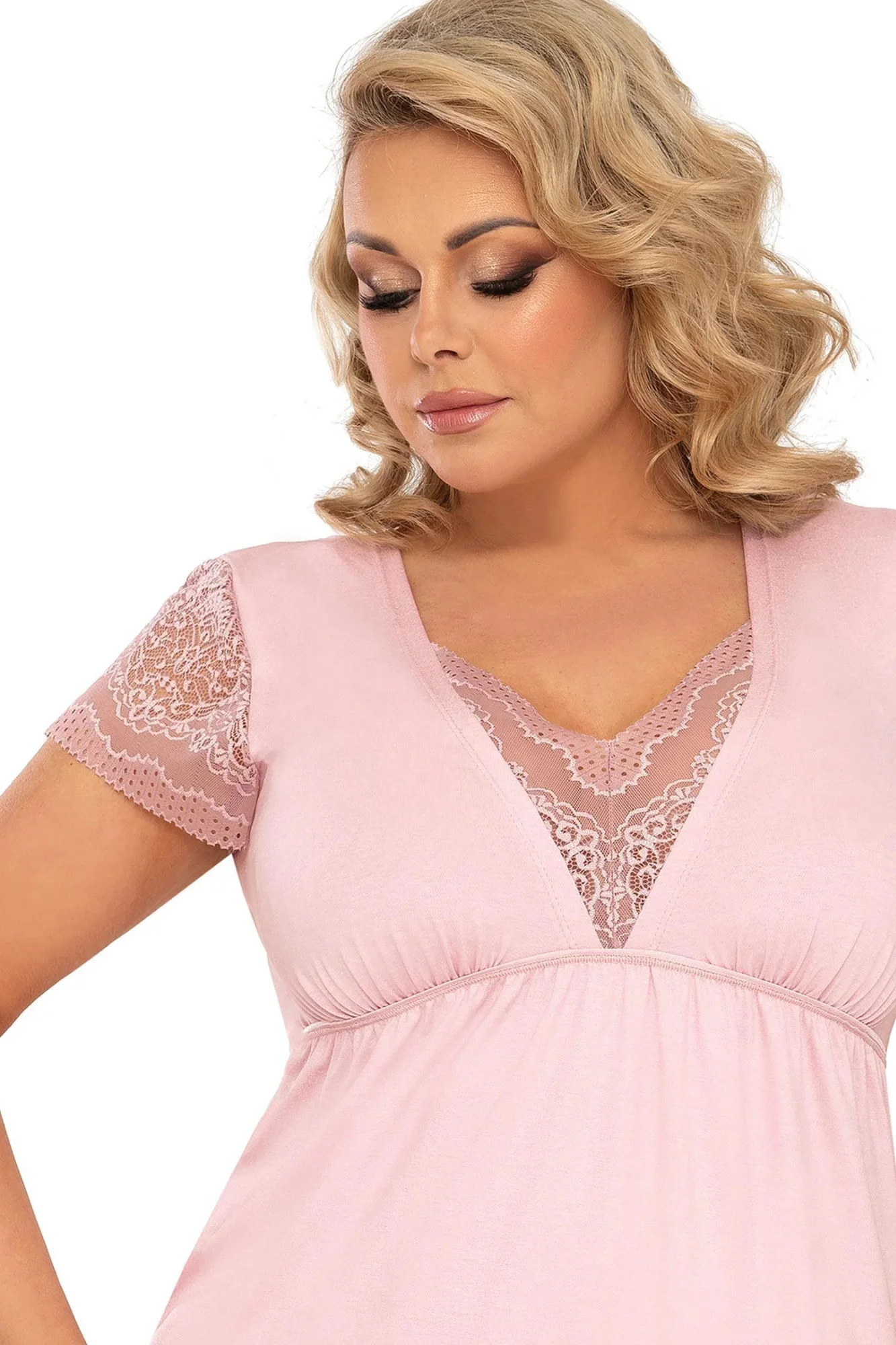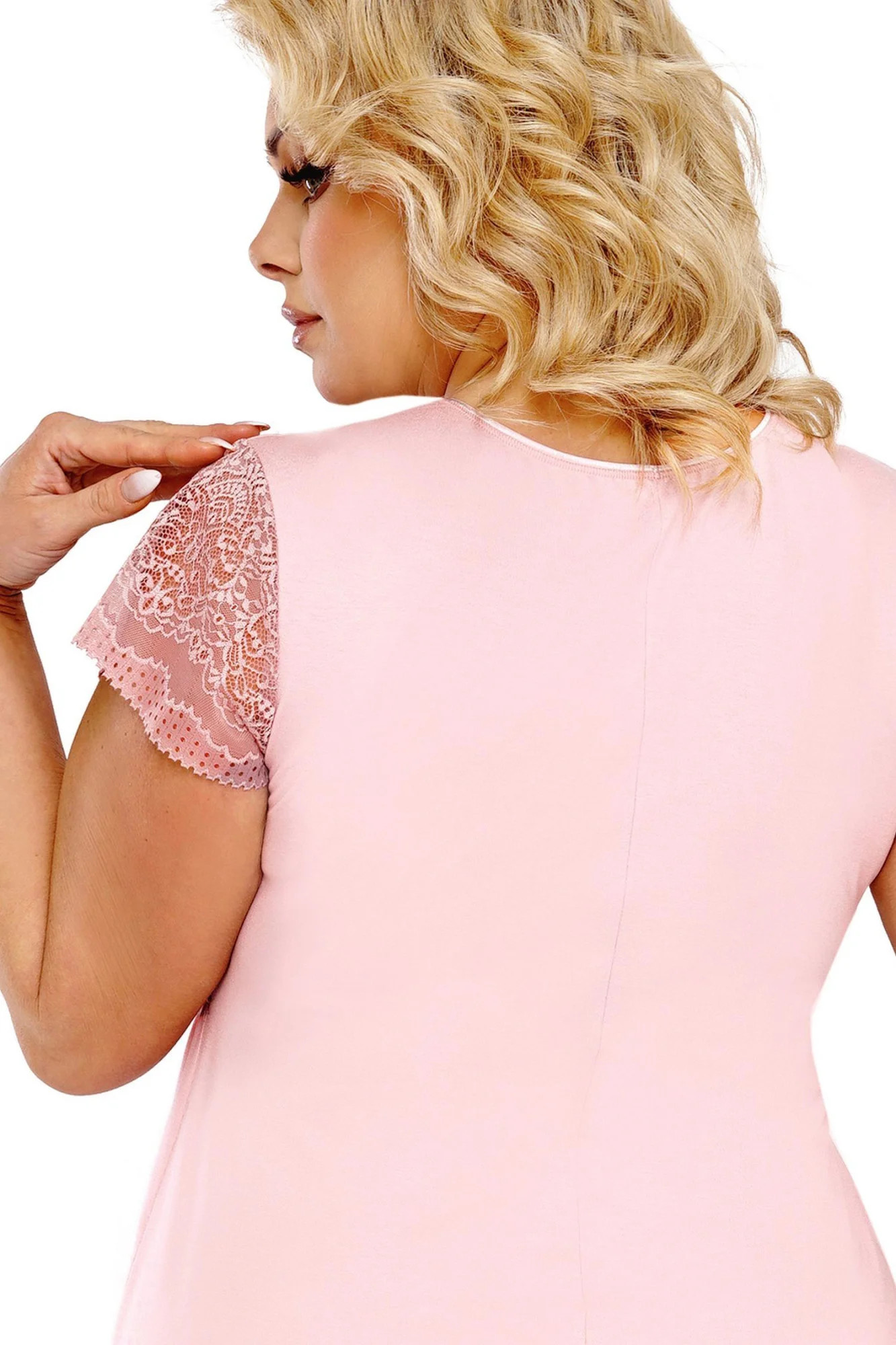 Nočná košeľa Celine plus Donna - ružová farba - vyrobená z veľmi kvalitnej viskózy - výstrih zdobený čipkou - krátke rukávy z efektnej čipky - pod košíčkami gumička