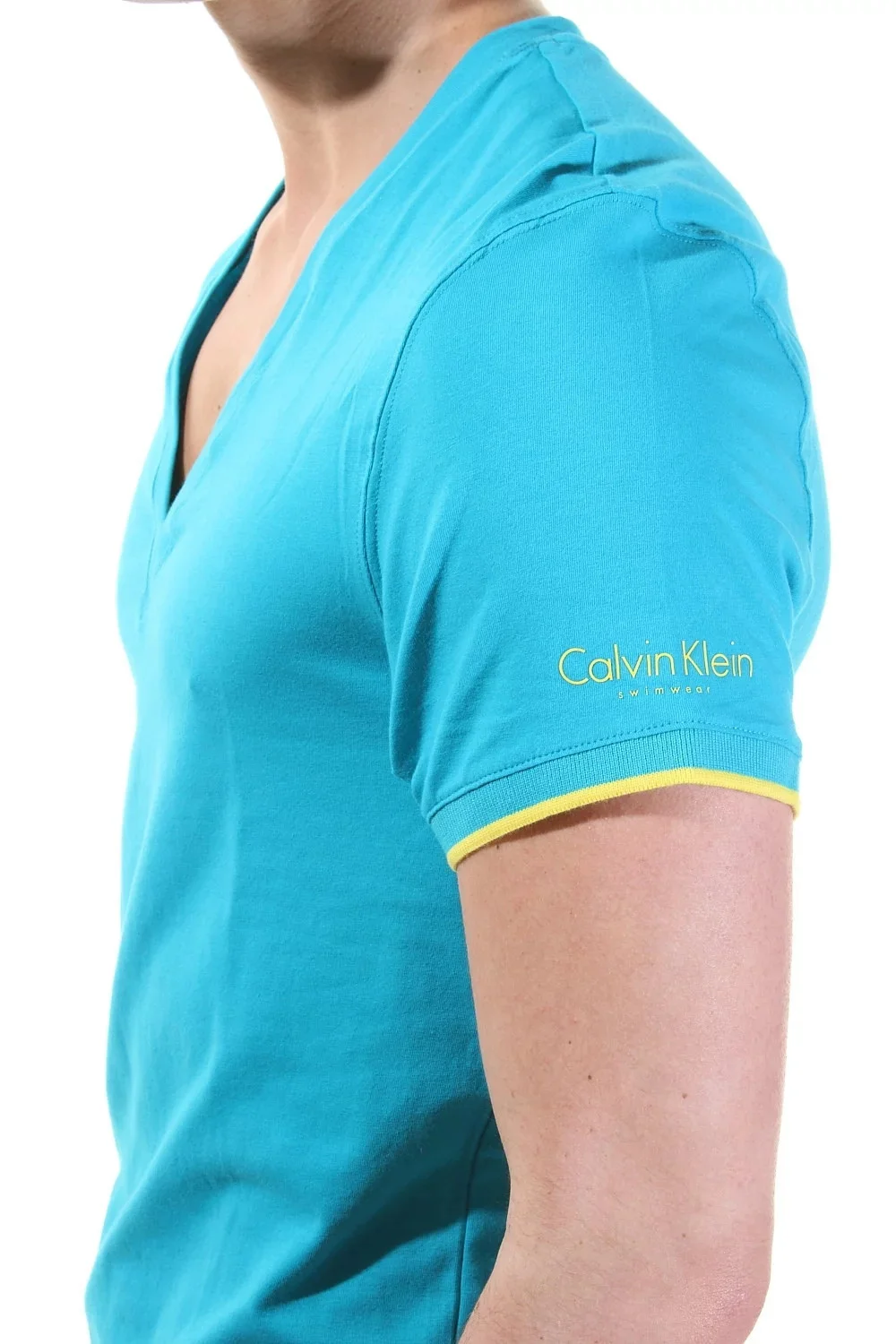 Tričko 58260Z3 má výstřřih do V, na bokoch rozparky a krátke rukávy zdobí žltý lem a nápis Calvin Klein.: