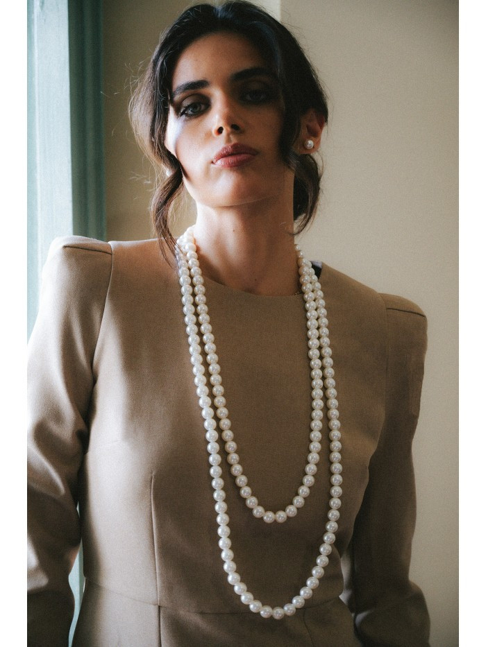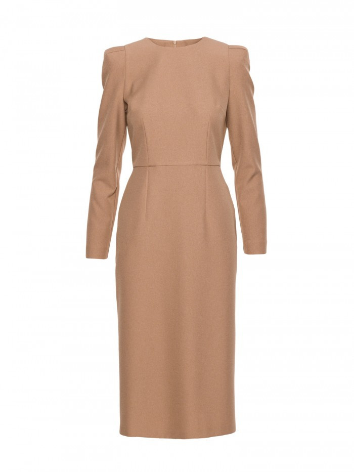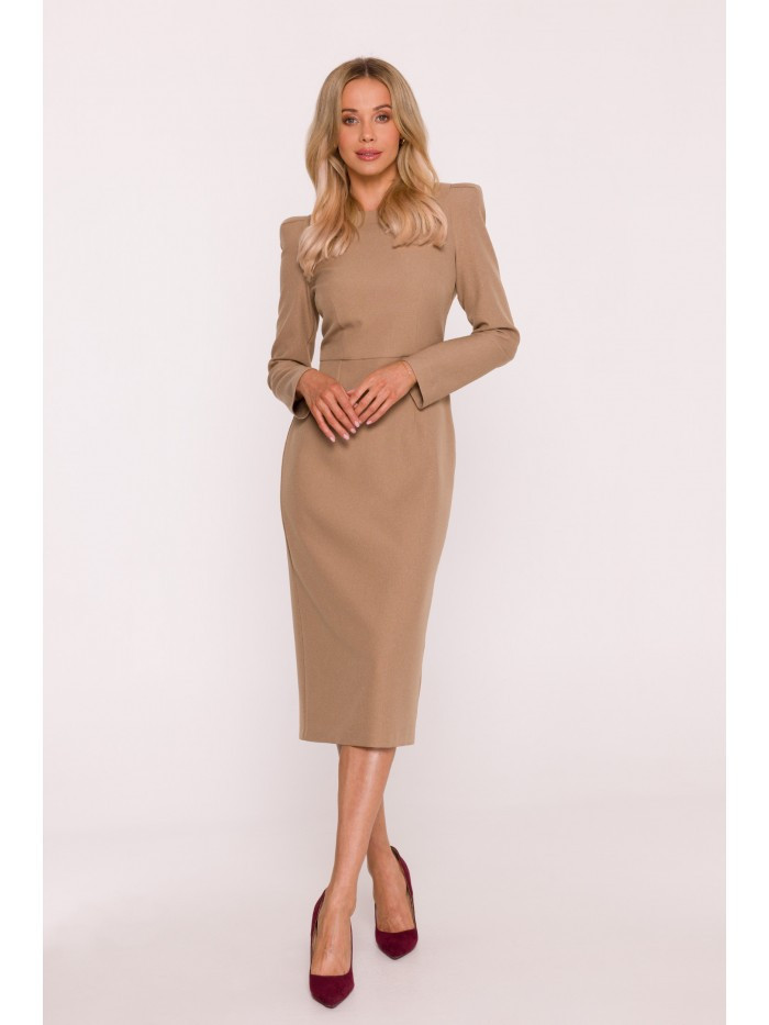 S412 Šaty v tvare ceruzky s ozdobnými ramenami - béžové