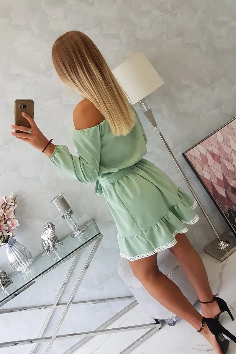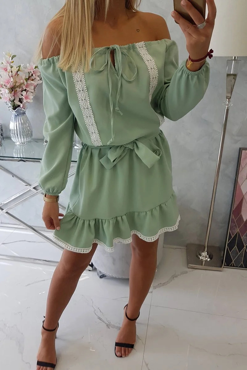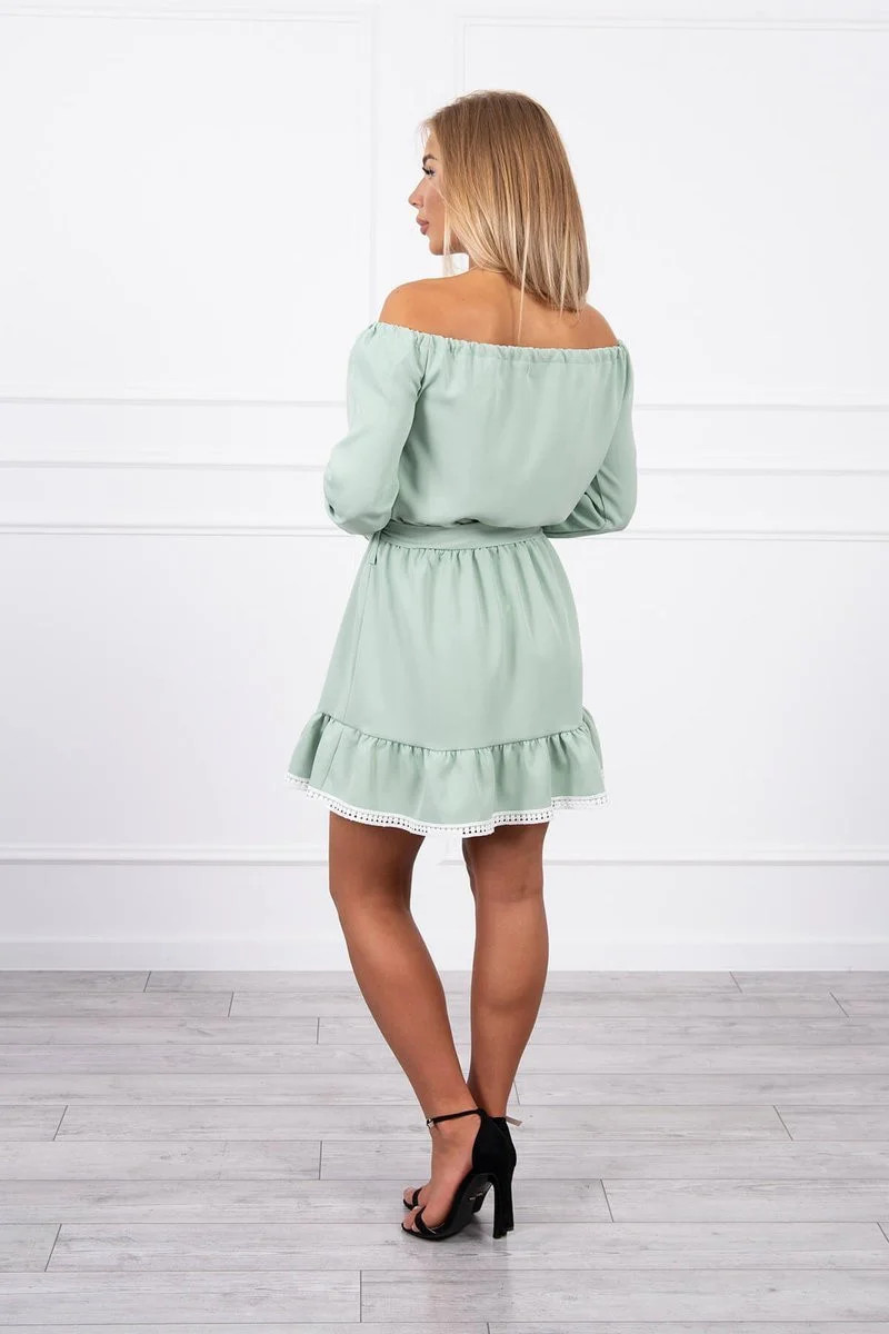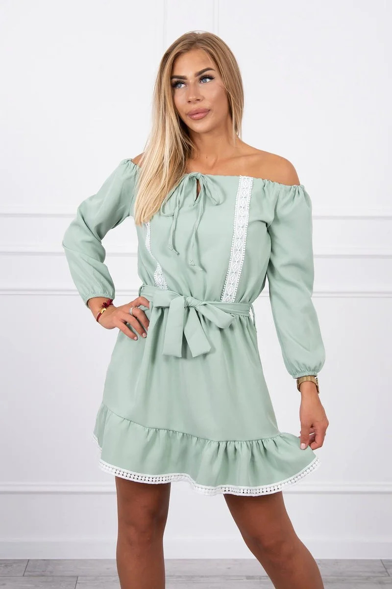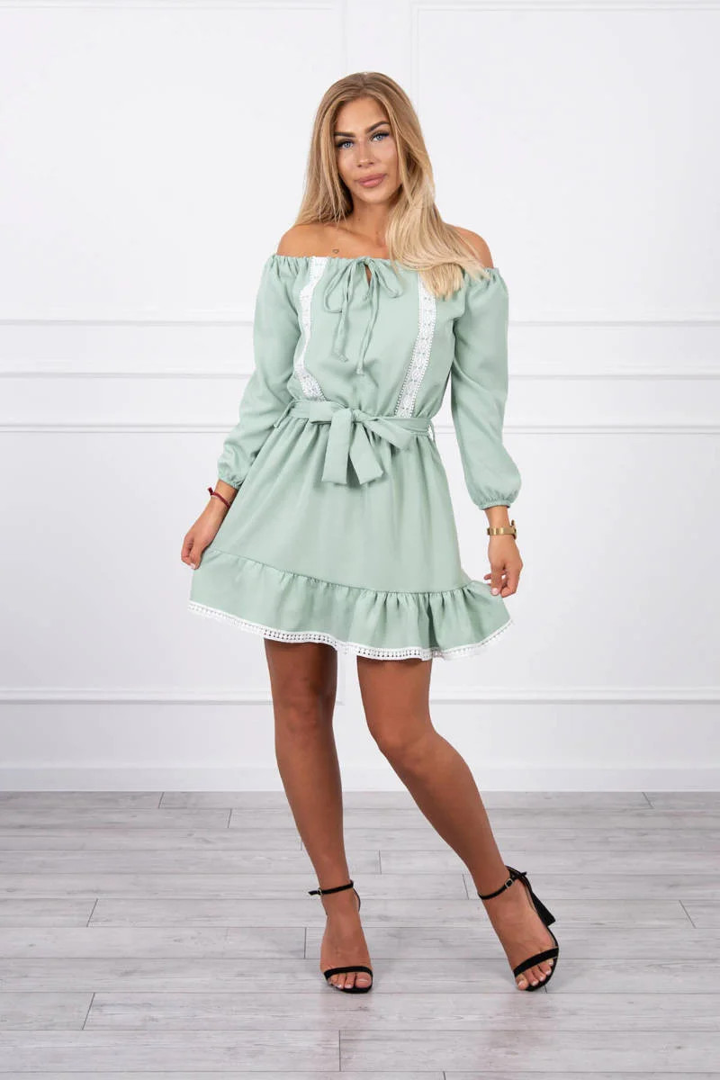 Šaty s odhalenými rameny a krajkou světle zelené barvy