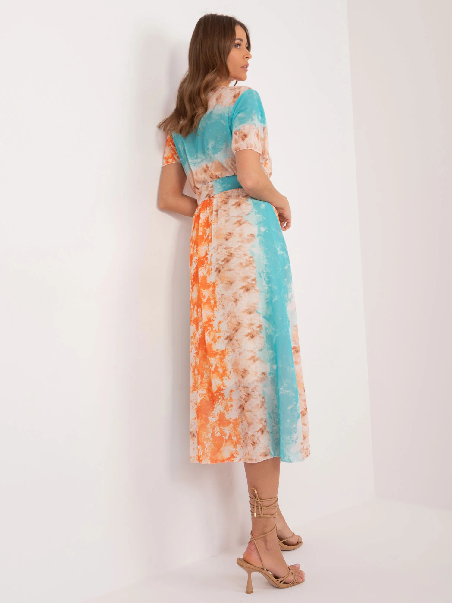 Wymiary sukienki w rozmiarze one size mierzone na płasko: szerokość pod pachami - 45 cm, długość całkowita - 122 cm, długość rękawa - 23 cm