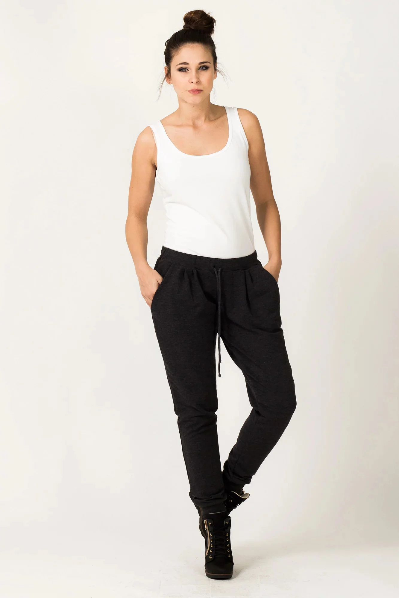 Tepláky z pletené teplákoviny v tmavě šedé barvě, dole zakončené širokým žebrováním, které je široké asi 10 cm. Velmi módní a pohodlné.