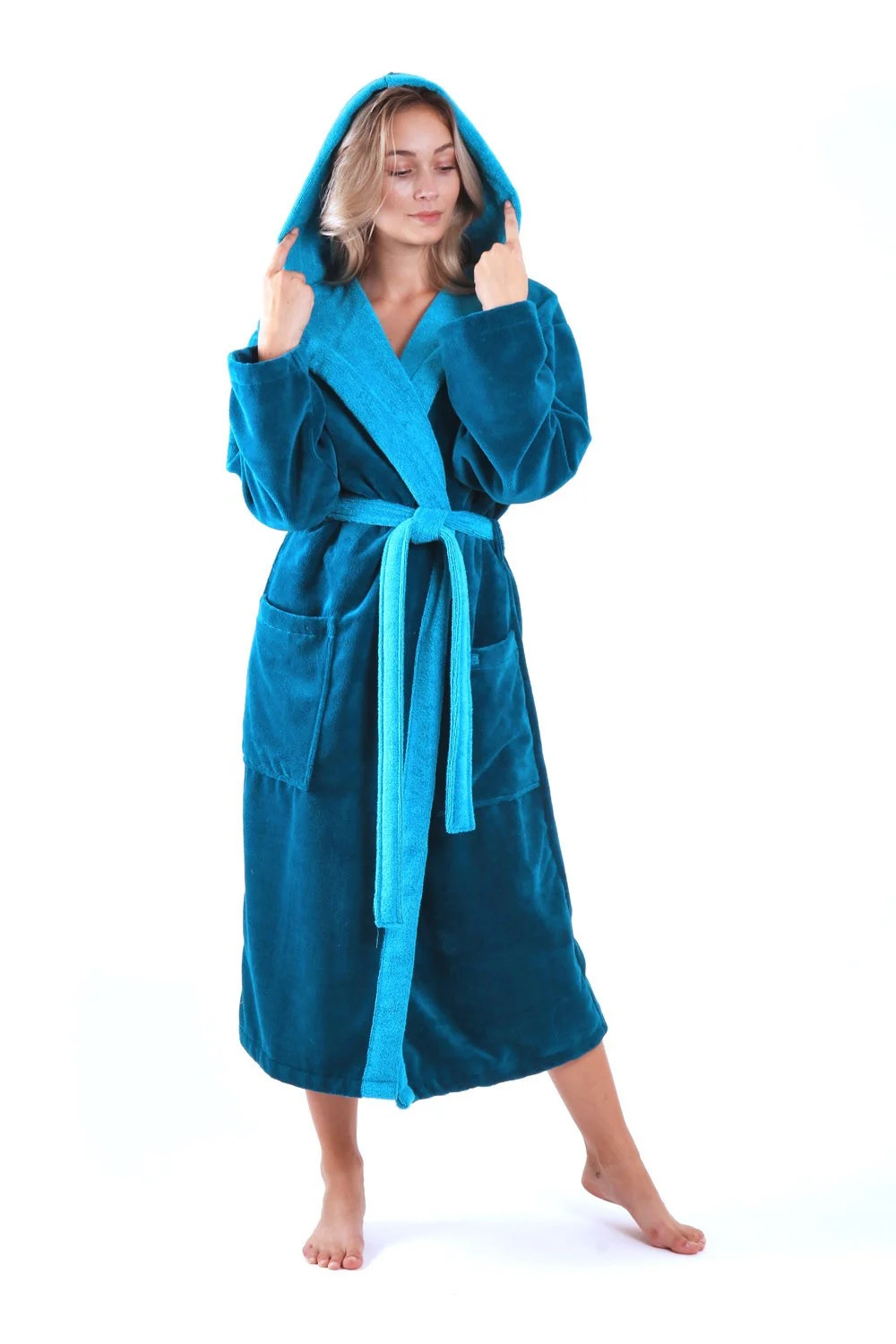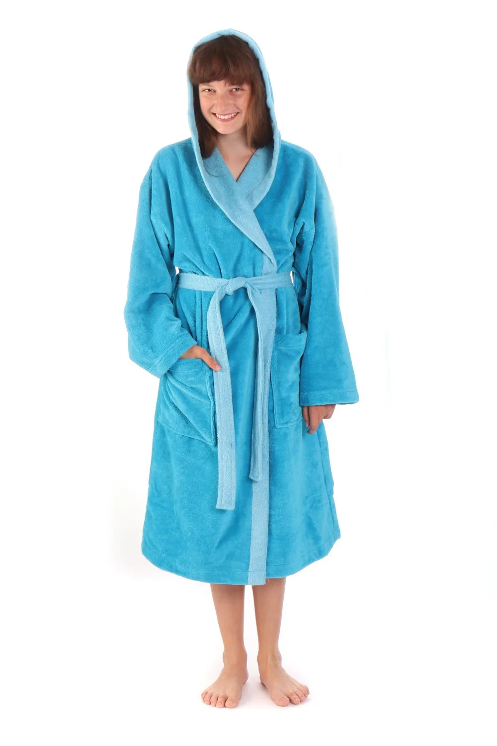 Střih s kapucí umožňuje nejen pohodlné vysušení vlasů, ale také vás- budete-li mít mokré vlasy- ochrání před chladem při přechodu z vířivky nebo bazénu.